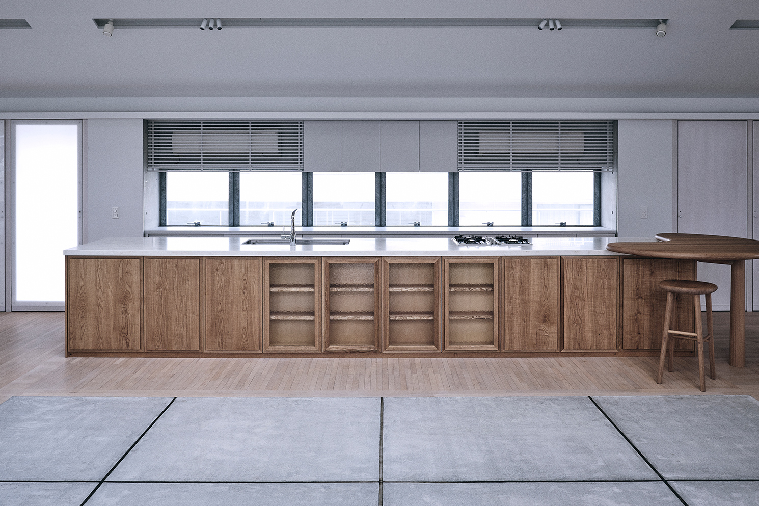 At the Aoyama showroom — which also functions as the workspace of the design studio KESIKI — visitors can experience the Wood You Like Company’s designs in a lived-in context. The kitchen island features side doors with hand-carved surface treatments that shift in character depending on the viewer’s position and the ambient light from the skylight. A table with a thick, planed top and solid legs anchors the space. Designed to invite gathering, it exemplifies our approach to craftsmanship and the expressive potential of natural wood.