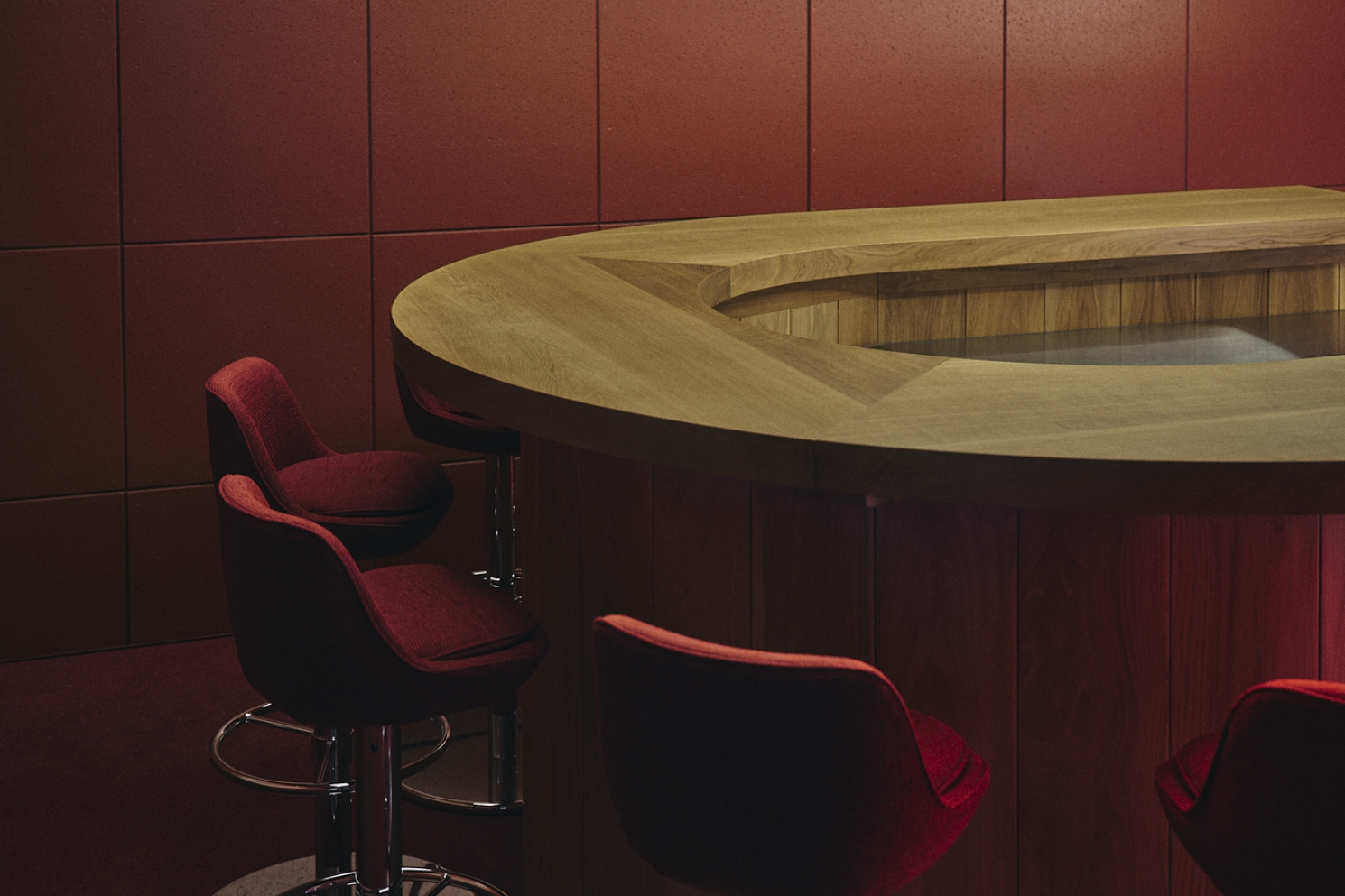 Within the Serendie Street Yokohama co-creation space, the U-shaped bar serves as a social nucleus where community members can naturally gather. Crafted from locally sourced oak, the bar exudes a sense of permanence and comfort that encourages extended engagement. The design promotes connection, aligning with the space’s overarching concept of fostering organic interactions. Behind the counter, shelving finished using the traditional naguri technique — typically applied to flooring — subtly reflects light, enriching the atmosphere with a dynamic and welcoming presence.